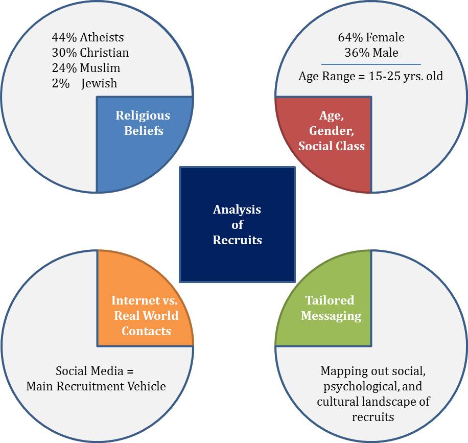 The diversity of the seven narratives makes tracking recruitment more difficult than tracking ideologically oriented, one-size-fits-most narratives. As we have seen, not all recruits are ideologically driven at the outset of recruitment. More importantly, the use of such methods dramatically increases the size of the potential recruiting pool to anyone who is significantly disaffected with society and/or with his/her own life in some way. These tactics and narratives used as recruiting techniques pose an expanded threat not only to France, but also to the United States.